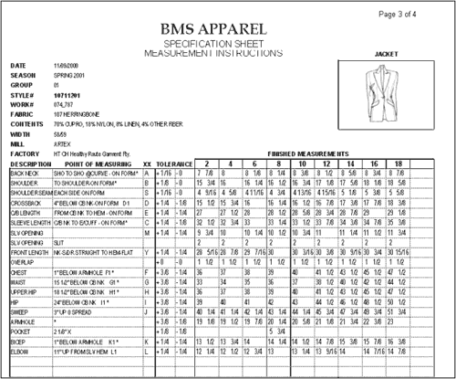 Рис. 4. Лист спецификации модели При составлении спецификации для модели, соотнесенной в системе с определенным типом одежды, нет необходимости начинать все "с нуля" и не требуется высокой квалификации: для хранящихся в системе типов одежды указываются все замеры, которые необходимо провести для пошива модели. Замеры геометрии модели производятся для одного базового размера. Перерасчет каждого замера для всех выпускаемых размеров модели реализуется автоматически, на основе предварительно внесенных шкале размеров и правил пересчета. Причем, благодаря тому, что правила задаются как совокупность различий между соседним размерами, в качестве базового может быть принят любой размер. Для всех категорий пользователей предусмотрен многоаспектный поиск данных по указываемым или выбираемым из справочников параметрам. Управление информационными процессами жизненного цикла модели. Система предоставляет возможность полного контроля и управления информацией о всех этапах работы с моделью. Информация системы доступна только зарегистрированным пользователям. Причем, доступ к тем или иным сведениям и функциям определяется полномочиями пользователя, назначаемыми в системе разграничения доступа. Система может использоваться для управления заказами на приобретение исходных материалов основной продукции, готовых изделий-комплектующих, материалов для образцов и купонов. Мощный многоаспектный поиск и способность генерации отчетов на основе выбираемых пользователем критериев позволяет легко поддерживать и анализировать систему, содержащую большой объем заказов. По своему назначению заказы на покупку материала подразделяются на предварительный заказ, формируемый дизайнером, заказ на купон, заказ на материалы для образцов моделей и заказ регулярного материала для массового производства. Каждый заказ имеет определенный статус, характеризующий его текущее состояние: этап создания, этапы утверждения поставщиком, заказчиком или завершенное состояние. При изменении статуса заказа в системе фиксируется дата и имя исполнителя. Естественно, возможности по манипулированию заказом определяются его текущим статусом. За счет этих ограничений удается избежать ряда пользовательских ошибок. Календарное планирование. В системе предусмотрена функция формирования календарного плана работ и контроля его выполнения. Формирование календарного плана производится путем обратного отсчета по вводимому пользователем производственному календарю, конечной дате и продолжительности каждого этапа работ. Предусмотрено 2 уровня контроля выпуска продукции, отличающихся детальностью отслеживаемых сведений. Оба уровня используются для контроля выполнения производственного графика при пошиве определенной модели на определенной фабрике. Контроль реализуется путем мониторинга определяемых пользователем событий и предполагает определение отклонений между запланированным и фактическим состоянием производственного процесса (Рис. 5).