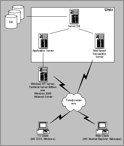 Рис. 6. Способы удаленного доступа к системе Терминальный доступ Реализуется при помощи специальной версии Windows NT Server - Windows NT Server, Terminal Server Edition, предназначенной для организации доступа к среде Windows NT в терминальном режиме, или Windows 2000 Advanced Server. В качестве терминалов может использоваться персональный компьютер, работающий под управлением MS-DOS или любой системы семейства Windows. Через телефонную сеть и Internet пользователь на клиентской машине связывается с сервером. При этом каждому клиенту, общающемуся с сервером через терминал, Windows NT Server, Terminal Server Edition выделяет сессию - собственную виртуальную среду, которую клиент воспринимает как полноценный компьютер на базе Windows NT Workstation 4.0. На самом терминальном ПК должны функционировать только базовые службы для доступа к сети и специальное клиентское ПО для общения с Windows NT Server, Terminal Server Edition. Никакой дополнительной настройки не требуется, так как всю вычислительную нагрузку несет не клиент, а сервер [7]. Далее из своей сессии каждый пользователь имеет возможность обратиться к серверу приложения уже через локальную сеть предприятия и запустить систему. Доступ по технологии WebSpeed. При использовании схемы взаимодействия по технологии WebSpeed пользователь может работать с системой, имея у себя на машине лишь средства доступа в Internet и любой Internet-броузер (Рис. 6). При этом реализуется следующий механизм (Рис. 7) [8]: 1. HTML-клиент, выполняющийся в Internet-броузере, генерирует запросы подключения к WEB-серверу. Каждый запрос реализуется в форме URL и адресуется Web-серверу. Последний пересылает этот запрос процессу WebSpeed Messenger.