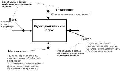 Рис. 2. Функциональный блок и интерфейсные дуги. На более низком уровне, а именно, уровне функционального блока связь IDEF0- и ФСА-моделей базируется на трех принципах: 1. Функция характеризуется числом, которое представляет собой стоимость или время выполнения этой функции. 2. Стоимость или время функции, которая не имеет декомпозиции, определяется разработчиком системы. Стоимость или время функции, которая имеет декомпозицию, определяется, как сумма стоимостей (времен) всех подфункций на данном уровне декомпозиции. Далее приведем различные типы функционально-стоимостных оценок технологий работы предприятия на примере одной российской торговой компании. В условиях рыночных отношений для эффективной и своевременной реализации товаров через торговые организации, подразделения и представительства торговой компании, необходимо моделирование и оценка технологии ее работы. В настоящее время моделирование и оценка технологий работы любых торговых компаний, позволяет решить следующий круг задач: