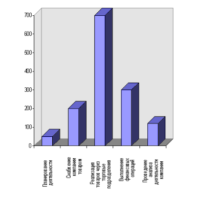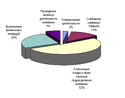 Рис. 3. Оценка месячных трудозатрат, связанных с выполнением бизнес-процессов торговой компании. Из Рис. 3 видно, что более половины всех трудозатрат приходятся на выполнение основного бизнес-процесса торговой компании - реализацию товаров через торговые подразделения компании.