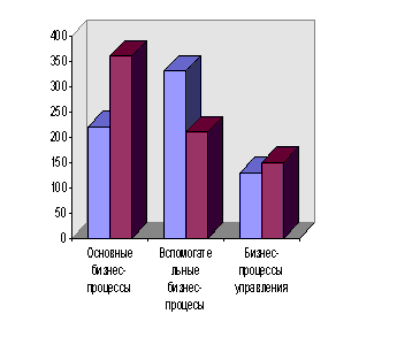 Рис. 6. Оценка бизнес-процессов торговой компании Из Рис.5 можно сделать вывод, что наиболее загруженными являются: коммерческий отдел, отдел логистики и бухгалтерия. Рис. 6 показывает, что до перераспределения в торговой компании наибольшей объем времени и средств занимали вспомогательные бизнес-процессы, но после перераспределения бизнес-процессов максимальные показатели времени и средств стали приходиться на выполнение основных бизнес-процессов, связанных с реализацией товаров через торговые подразделения компании. Данный метод оценки позволяет: