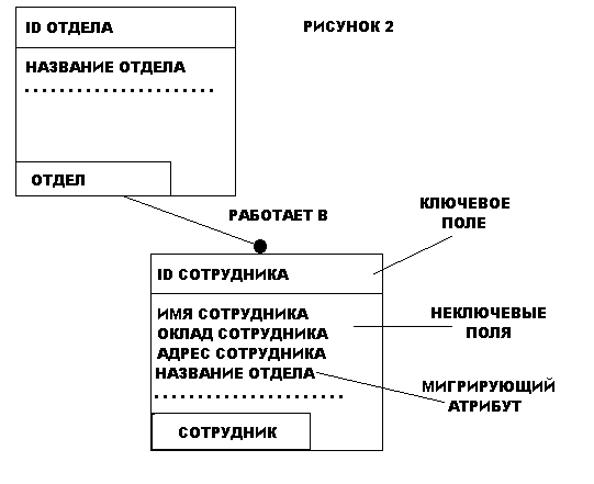 После проведенного анализа можно назвать два потенциальных ключа - первый "Номер сотрудника" и комбинация, включающая поля "имя сотрудника" и "Дата рождения сотрудника". Так как атрибут "Номер сотрудника" имеет самые короткие и уникальные значения, то он лучше других подходит для первичного ключа. При выборе первичного ключа для сущности, разработчики модели часто используют дополнительный (суррогатный) ключ, т.е. произвольный номер, который уникальным образом определяет запись в сущности. Атрибут "Номер сотрудника" является примером суррогатного ключа. Суррогатный ключ лучше всего подходит на роль первичного ключа потому, что является коротким и быстрее всего идентифицирует экземпляры в объекте. К тому же суррогатные ключи могут автоматически генерироваться системой так, чтобы нумерация была сплошной, т.е. без пропусков. Потенциальные ключи, которые не выбраны первичными, могут быть использованы в качестве вторичных или альтернативных ключей. С помощью альтернативных ключей часто отображают различные индексы доступа к данным в конечной реализации реляционной базы. Если сущности в IDEF1X диаграмме связаны, связь передает ключ (или набор ключевых атрибутов) дочерней сущности. Эти атрибуты называются внешними ключами. Внешние ключи определяются как атрибуты первичных ключей родительского объекта, переданные дочернему объекту через их связь. Передаваемые атрибуты называются мигрирующими. Классификация сущностей в IDEF1X. Зависимые и независимые сущности. При разработке модели, зачастую, приходится сталкиваться с сущностями, уникальность которых зависит от значений атрибута внешнего ключа. Для этих сущностей (для уникального определения каждой сущности) внешний ключ должен быть частью первичного ключа дочернего объекта. Дочерняя сущность, уникальность которой зависит от атрибута внешнего ключа, называется зависимой сущностью. В примере на рис.1 сущность СОТРУДНИК является зависимой сущностью потому, что его идентификация зависит от сущности ОТДЕЛ. В обозначениях IDEF1X зависимые сущности представлены в виде закругленных прямоугольников. Зависимые сущности далее классифицируются на сущности, которые не могут существовать без родительской сущности и сущности, которые не могут быть идентифицированы без использования ключа родителя (сущности, зависящие от идентификации). Сущность СОТРУДНИК принадлежит ко второму типу зависимых сущностей, так как сотрудники могут существовать и без отдела. Напротив, существуют ситуации в которых сущность зависит от существования другой сущности. Рассмотрим две сущности: ЗАПРОС, используемый для отслеживания запросов покупателей, и ПОЗИЦИЯ ЗАПРОСА, который отслеживает отдельные элементы в ЗАПРОСе. Связь между этими двумя сущностями может быть выражена в виде ЗАПРОС <содержит> один или несколько ПОЗИЦИЙ ЗАПРОСА. В этом случае, ПОЗИЦИЯ ЗАПРОСА зависит от существования ЗАКАЗА. Сущности, независящие при идентификации от других объектов в модели, называются независимыми сущностями. В вышеописанном примере сущность ОТДЕЛ можно считать независимой. В IDEF1X независимые сущности представлены в виде прямоугольников. Типы связей между сущностями. Идентифицирующие и неидентифицирующие связи. В IDEF1X концепция зависимых и независимых сущностей усиливается типом взаимосвязей между двумя сущ