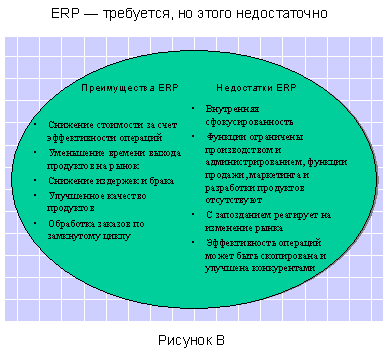 ERP определило производственные правила игры. Также как любительская или профессиональная футбольная команда знают что исход игры будет зависеть от успеха на поле, также производители знают, что фундаментальные производственные стандарты могут привести к предсказуемым, эффективным операциям. Но если все используют одни и те же правила игры, достаточно ли их для уверенности в успехе? Достаточно ли ERP? Если победа означает, что методы успешной конкуренции найдены, то победителям нужны новые игры и новые правила. Так как все больше и больше производителей внедряют системы ERP, и так как покупатели требуют большего, то очевидно, что двадцатипятилетние правила ERP не дают чистого и продолжительного конкурентного преимущества. Эффективность производства все еще требуется, но ее явно не достаточно. Как показано на рисунке А использование ERP всегда сфокусировано исключительно на внутренних процессах. ERP оптимизирует прием заказов, планирование производства, закупку, производство, доставку и управление - то есть все внутренние операции. Но если конкурентное преимущество в следующем десятилетии будет определяться созданием и доставкой покупательской ценности, текущая модель ERP недостаточна. Производители должны расширять правила игры и включать нового игрока - покупателя.