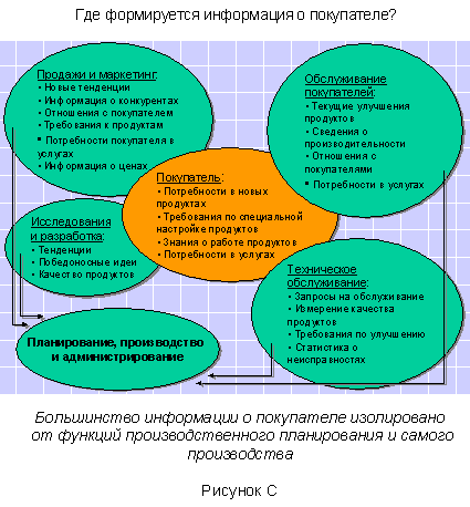 Ответ в том, что производители решительно принимают решения по выбору продуктов и рынка; но эти решения, и лица их принимающие изолированы от исполнительных подразделений организаций. Критическая информация о покупателе и знание рынка удалены из основной системы планирования бизнеса и изолированы в различных местах, разбросанных по организации. Не существует конкретного и действенного способа проводить знания о покупателе через организацию. Как показано на рисунке С покупательская информация существует в подразделениях из четырех основных функциональных областей: