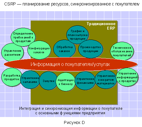 Каждое из этих подразделений проводит значительное время, взаимодействуя с покупателем. Но в большинстве традиционных производственных организаций эти подразделения тратят мало времени на взаимодействие с плановыми или производственными отделами. За создание продуктов отвечает конструкторский отдел. Отдел обслуживания покупателей отвечает за организацию приема заказов. До сих пор, происхождение знаний о том, что действительно требуется, что работает, а что нет, что будет продаваться, а что нет исходит от покупателя. Задача подразделений продажи и маркетинга - понимать нужды покупателей и пытаться предложить их решение, создавать спрос. Кроме того они владеют ценной информацией о новых рыночных тенденциях, давлении конкурентов, о проблемах обслуживания покупателей, ценообразовании и спросе. Подразделения предприятия по обслуживанию покупателей, и техническому обслуживанию содержат много другой информации, касающейся того, с какими продуктами есть проблемы, какие усовершенствования покупатели спрашивают чаще всего и какие предлагаемые услуги могут быть наиболее ценными для покупателя. Наконец конструкторский отдел, а также отдел исследований и разработки работают над новыми продуктами и прототипами - то есть над следующими победными продуктами. Как новые продукты будут приняты на рынке, что имеет приемлемую цену, а что нет - все это жизненно важная для бизнеса информация. CSRP - это первая бизнес методология, которая интегрирует деятельность предприятия, ориентированную на покупателе, в центр системы управления бизнесом. CSRP устанавливает методологию ведения бизнеса, основанную на текущей информации о покупателе. CSRP сдвигает фокус предприятия с планирования от потребностей производства к планированию от заказов покупателей. Информация о покупателях и услуги вплавляются в основу организации (смотри рисунок D). Деятельность по производственному планированию не просто расширяется, а удаляется и заменяется запросами покупателей, переданными из подразделений организации, ориентированных на работу с покупателями. CSRP переопределяет практику бизнеса, фокусируя ее на рыночной активности, а не на производственной деятельности. Бизнес-процессы синхронизируются с деятельностью покупателей. Например, переопределяется процесс обработки заказов. Обработка заказов расширяется и вместо простой функции ввода заказа, действительно интегрирует функции продажи и маркетинга с покупателем. Обработка заказов теперь не начинается с собственно заказа, она начинается с покупателя или даже с перспектив продажи.