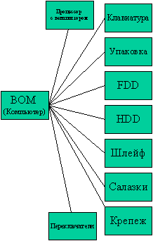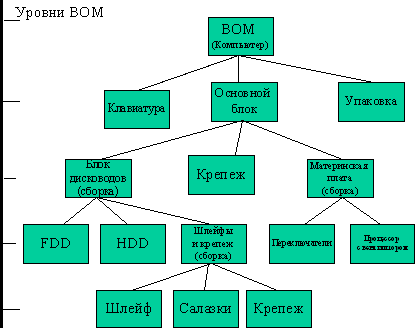 Обратите внимание на то, что на различных уровнях ВОМ могут находиться одинаковые товарные позиции, как например Крепеж на различных уровнях сборочной спецификации компьютера. При разузловании из приведенного выше древовидного списка получается линейный, служащий для формирования заказа на закупку: