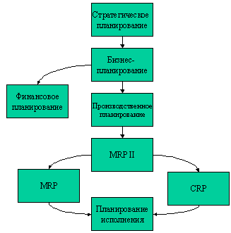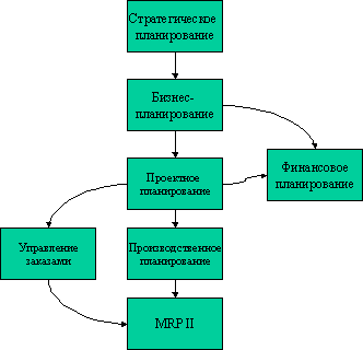Система планирования MRP II.Перейдем теперь к более подробному описанию системы планирования МРП П. Следует сразу же сказать, что практически все основные системы планирования очень тесно взаимосвязаны между собой и поэтому, разбирая МРП П, мы будем вынуждены затронуть все остальные системы планирования. Для большей ясности нарисуем картину условной взаимосвязи основных плановых систем.