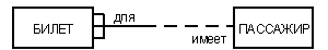 Каждый экземпляр сущности должен быть отличим от любого другого экземпляра той же сущности (это требование в некотором роде аналогично требованию отсутствия кортежей-дубликатов в реляционных таблицах). Связь - это графически изображаемая ассоциация, устанавливаемая между двумя сущностями. Эта ассоциация всегда является бинарной и может существовать между двумя разными сущностями или между сущностью и ей же самой (рекурсивная связь). В любой связи выделяются два конца (в соответствии с существующей парой связываемых сущностей), на каждом из которых указывается имя конца связи, степень конца связи (сколько экземпляров данной сущности связывается), обязательность связи (т.е. любой ли экземпляр данной сущности должен участвовать в данной связи). Связь представляется в виде линии, связывающей две сущности или ведущей от сущности к ней же самой. При это в месте "стыковки" связи с сущностью используются трехточечный вход в прямоугольник сущности, если для этой сущности в связи могут использоваться много (many) экземпляров сущности, и одноточечный вход, если в связи может участвовать только один экземпляр сущности. Обязательный конец связи изображается сплошной линией, а необязательный - прерывистой линией. Как и сущность, связь - это типовое понятие, все экземпляры обеих пар связываемых сущностей подчиняются правилам связывания. В изображенном ниже примере связь между сущностями БИЛЕТ и ПАССАЖИР связывает билеты и пассажиров. При том конец сущности с именем "для" позволяет связывать с одним пассажиром более одного билета, причем каждый билет должен быть связан с каким-либо пассажиром. Конец сущности с именем "имеет" означает, что каждый билет может принадлежать только одному пассажиру, причем пассажир не обязан иметь хотя бы один билет. Лаконичной устной трактовкой изображенной диаграммы является следующая: