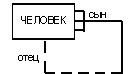 На следующем примере изображена рекурсивная связь, связывающая сущность ЧЕЛОВЕК с ней же самой. Конец связи с именем "сын" определяет тот факт, что у одного отца может быть более чем один сын. Конец связи с именем "отец" означает, что не у каждого человека могут быть сыновья. Лаконичной устной трактовкой изображенной диаграммы является следующая:
