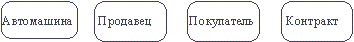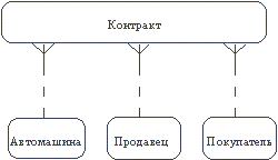 Обращаясь к приведенным выше выдержкам из интервью, видно, что сущности, которые могут быть идентифицированы с главным менеджером - это автомашины и продавцы. Продавцу важны автомашины и связанные с их продажей данные. Для администратора важны покупатели, автомашины, продавцы и контракты. Исходя из этого, выделяются 4 сущности (автомашина, продавец, покупатель, контракт), которые изображаются на диаграмме следующим образом (рисунок 4.2). Рис. 4.2. Следующим шагом моделирования является идентификация связей. Связь (Relationship) - поименованная ассоциация между двумя сущностями, значимая для рассматриваемой предметной области. Связь - это ассоциация между сущностями, при которой, как правило, каждый экземпляр одной сущности, называемой родительской сущностью, ассоциирован с произвольным (в том числе нулевым) количеством экземпляров второй сущности, называемой сущностью-потомком, а каждый экземпляр сущности-потомка ассоциирован в точности с одним экземпляром сущности-родителя. Таким образом, экземпляр сущности-потомка может существовать только при существовании сущности родителя. Связи может даваться имя, выражаемое грамматическим оборотом глагола и помещаемое возле линии связи. Имя каждой связи между двумя данными сущностями должно быть уникальным, но имена связей в модели не обязаны быть уникальными. Имя связи всегда формируется с точки зрения родителя, так что предложение может быть образовано соединением имени сущности-родителя, имени связи, выражения степени и имени сущности-потомка. Например, связь продавца с контрактом может быть выражена следующим образом: