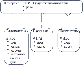 Альтернативные модели сущностей: Вариант 1 (плохой) Вариант 2 (существенно лучше, если подтипы действительно существуют) Вариант 3 (годится при наличии осмысленного супертипа D). 4.5.2. Виды нотаций Конечно, способ представления ER-диаграмм, используемый компанией Oracle, не является единственным. В этом подразделе мы представляем несколько других нотаций. 4.5.2.1. Case-метод Баркера Нотация ER-диаграммы была впервые введена П. Ченом (Chen) и получила дальнейшее развитие в работах Баркера. Метод Баркера будет излагаться на примере предметной области компании по торговле автомобилями. Ниже приведены выдержки из интервью, проведенного с персоналом компании. Главный менеджер: одна из основных обязанностей - содержание автомобильного имущества. Он должен знать, сколько заплачено за машины и каковы накладные расходы. Обладая этой информацией, он может установить нижнюю цену, за которую мог бы продать данный экземпляр. Кроме того, он несет ответственность за продавцов и ему нужно знать, кто что продает и сколько машин продал каждый из них. Продавец: ему нужно знать, какую цену запрашивать и какова нижняя цена, за которую можно совершить сделку. Кроме того, ему нужна основная информация о машинах: год выпуска, марка, модель и т.п. Администратор: его задача сводится к составлению контрактов, для чего нужна информация о покупателе, автомашине и продавце, поскольку именно контракты приносят продавцам вознаграждения за продажи. Первый шаг моделирования - извлечение информации из интервью и выделение сущностей. Сущность (Entity) - реальный либо воображаемый объект, имеющий существенное значение для рассматриваемой предметной области, информация о котором подлежит хранению (рисунок 4.1).
