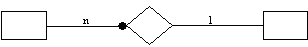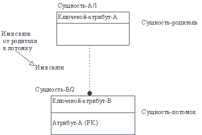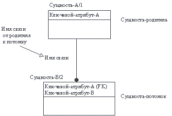 Если экземпляр сущности-потомка однозначно определяется своей связью с сущностью-родителем, то связь называется идентифицирующей, в противном случае - неидентифицирующей. Связь изображается линией, проводимой между сущностью-родителем и сущностью-потомком с точкой на конце линии у сущности-потомка. Мощность связи обозначается как показано на рисунке 4.14 (мощность по умолчанию - N). Рис.4.14. Мощность связи Идентифицирующая связь между сущностью-родителем и сущностью-потомком изображается сплошной линией (рисунок 4.15). Сущность-потомок в идентифицирующей связи является зависимой от идентификатора сущностью. Сущность-родитель в идентифицирующей связи может быть как независимой, так и зависимой от идентификатора сущностью (это определяется ее связями с другими сущностями). Рис. 4.15. Идентифицирующая связь Пунктирная линия изображает неидентифицирующую связь (рисунок 4.16). Сущность-потомок в неидентифицирующей связи будет независимой от идентификатора, если она не является также сущностью-потомком в какой-либо идентифицирующей связи. Рис. 4.16. Неидентифицирующая связь Атрибуты изображаются в виде списка имен внутри блока сущности. Атрибуты, определяющие первичный ключ, размещаются наверху списка и отделяются от других атрибутов горизонтальной чертой (рисунок 4.17). Рис. 4.17. Атрибуты и первичные ключи Сущности могут иметь также внешние ключи (Foreign Key), которые могут использоваться в качестве части или целого первичного ключа или неключевого атрибута. Внешний ключ изображается с помощью помещения внутрь блока сущности имен атрибутов, после которых следуют буквы FK в скобках (рисунок 4.18). Рис. 4.18. Примеры внешних ключей 4.5.2.3. Подход, используемый в CASE-средстве Vantage Team Builder В CASE-средстве Vantage Team Builder (Westmount I-CASE) используется один из вариантов нотации П. Чена. На ER-диаграммах сущность обозначается прямоугольником, содержащим имя сущности (рисунок 4.19), а связь - ромбом, связанным линией с каждой из взаимодействующих сущностей. Числа над линиями означают степень связи. Рис. 4.19. Обозначение сущностей и связей Связи являются многонаправленными и могут иметь атрибуты (за исключением ключевых). Выделяют два вида связей: