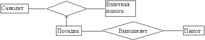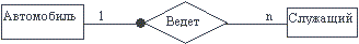 В необязательной связи (рисунок 4.20) могут участвовать не все экземпляры сущности. Рис. 4.20. Необязательная связь В отличие от необязательной связи в полной (total) связи участвуют все экземпляры хотя бы одной из сущностей. Это означает, что экземпляры такой связи существуют только при условии существования экземпляров другой сущ-ности. Полная связь может иметь один из 4-х видов: обязательная связь, слабая связь, связь "супертип-подтип" и ассоциативная связь. Обязательная (mandatory) связь описывает связь между "независимой" и "зависимой" сущностями. Все экземпляры зависимой ("обязательной") сущности могут существовать только при наличии экземпляров независимой ("необязательной") сущности, т.е. экземпляр "обязательной" сущности может существовать только при условии существования определенного экземпляра "необязательной" сущности. В примере (рисунок 4.21) подразумевается, что каждый автомобиль имеет по крайней мере одного водителя, но не каждый служащий управляет машиной. Рис. 4.21. Обязательная связь В слабой связи существование одной из сущностей, принадлежащей некоторому множеству ("слабой") зависит от существования определенной сущности, принадлежащей другому множеству ("сильной"), т.е. экземпляр "слабой" сущности может быть идентифицирован только посредством экземпляра "сильной" сущности. Ключ "сильной" сущности является частью составного ключа "слабой" сущности. Слабая связь всегда является бинарной и подразумевает обязательную связь для "слабой" сущности. Сущность может быть "слабой" в одной связи и "сильной" в другой, но не может быть "слабой" более, чем в одной связи. Слабая связь может не иметь атрибутов. Пример на рисунке 4.22: ключ (номер) строки в документе может не быть уникальным и должен быть дополнен ключом документа. Рис.4.22. Слабая связь Связь "супертип-подтип" изображена на рисунке 4.23. Общие характеристики (атрибуты) типа определяются в сущности-супер-типе, сущность-подтип наследует все характеристики супертипа. Экземпляр подтипа существует только при условии существования определенного экземпляра супертипа. Подтип не может иметь ключа (он импортирует ключ из супертипа). Сущность, являющаяся супертипом в одной связи, может быть подтипом в другой связи. Связь супертипа не может иметь атрибутов. Рис. 4.23. Связь "супертип-подтип" В ассоциативной связи каждый экземпляр связи (ассоциативный объект) может существовать только при условии существования определенных экземп-ляров каждой из взаимосвязанных сущностей. Ассоциативный объект - объект, являющийся одновременно сущностью и связью. Ассоциативная связь - это связь между несколькими "независимыми" сущностями и одной "зависимой" сущностью. Связь между независимыми сущ-ностями имеет атрибуты, которые определяются в зависимой сущности. Таким образом, зависимая сущность определяется в терминах атрибутов связи между остальными сущностями. В примере на рисунке 4.24 самолет выполняет посадку на взлетную полосу в заданное время при оп-ределенной скорости и направлении ветра. Поскольку эти характеристики при-менимы только к конкретной посадке, они являются атрибутами посадки, а не самолета или взлетной полосы. Пилот, выполняющий посадку, связан гораздо сильнее с конкретной посадкой, чем с самолетом или взлетной полосой. Рис. 4.24. Ассоциативная связь Первичный ключ каждого типа сущнос