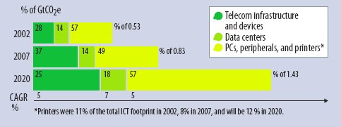В отчете также производится классификация выбросов GSG по вине ICT: выбросы из-за потребности поддержки фиксированной и мобильной инфраструктур телекоммуникаций/Internet; выбросы, связанные с наличием центров данных; выбросы по вине устройств «на краю сети» (Edge of the Network). При обсуждении проблемы выбросов в сообществе ICT наибольшее внимание уделяется центрам данным, используемым в академических и производственных организациях или образующим «серверную часть» Internet (центры данных, используемые в Google, Amazon, Yahoo и Microsoft). В этом есть смысл, поскольку такие «суперкластеры» включают сотни тысяч PC. Тем не менее, в отчете утверждается, что объем выбросов GSG, связанных с центрами данных, в 2020 г. составит менее 20% от общего объема выбросов по вине ITC. Основная часть выбросов (57%) поступит с «края сети»: от PC, периферийного оборудования и принтеров. Это связано с громадными масштабами роста использования PC в Китае и Индии. К 2020 г. в мире будет иметься 4 миллиарда PC.