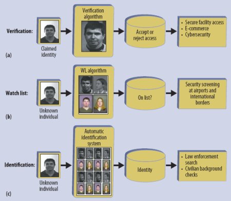 Система распознавания по отпечаткам пальцев может использоваться как для проверки, так и для идентификации. При проверке система сравнивает введенный отпечаток пальца с «зарегистрированным» отпечатком для проверки того, что они происходят от одного и того же пальца (сопоставление 1:1). При идентификации система сравнивает введенный отпечаток пальца со всеми хранимыми в базе данных отпечатками зарегистрированных пользователей, чтобы определить, не является ли данный человек одним их них (сопоставление 1:N). В программе Министерства внутренней безопасности США осуществляется программа US-VISIT, в рамках которой организации, выдающие визы для въезда в страну, и точки въезда обеспечиваются технологией распознавания по отпечаткам пальцев, что позволяет федеральному правительству устанавливать и проверять личности людей, посещающих США. С 2004 г. крупномасштабная система распознавания личности по отпечаткам пальцев обработала данные о более чем 100 миллионах людей, желавших посетить США. Эта система выявляет террористов, преступников и незаконных иммигрантов путем сравнения отпечатков пальцев лица, претендующего на получение визы, с отпечатками пальцев, хранимыми в базе данных отслеживаемых личностей, а также проверки того, что человек, пересекающий границу, является именно тем, кому выдавалась виза. Растущий список коммерческих и правительственных приложений распознавания по отпечаткам пальцев, а также наличие компактных и недорогих датчиков и мощных процессоров приводят к повышению потребности в полностью автоматических, высокоточных систем, работающих в масштабе реального времени. Системы следующего поколения могут принести много пользы, но для их создания требуется решить ряд проблем, над которыми в настоящее время работают исследователи. Рама Челаппа, Раван Синха и П. Джонатан Филлипс (Rama Chellappa, University of Maryland, College Park, Pawan Sinha, Massachusetts Institute of Technology, P. Jonathon Phillips, National Institute of Standards and Technology, Gaithersburg, Maryland) представили статью «Распознавание по чертам лица компьютерами и людьми» («Face Recognition by Computers and Humans»). В большинстве ситуаций от человека распознание людей по их лицам не требует никаких усилий. Но под силу ли это компьютерам? Этот вопрос привел к образованию направления автоматического распознания по чертам лица, приведшего к активным исследованиям в областях машинного зрения, распознавания образов и зрительного восприятия. В последние два десятилетия проблеме распознавания по лицу уделялось значительное внимание в различных дисциплинах, и заметны существенные продвижения в фундаментальных и прикладных исследованиях, разработке продуктов и приложений. Системы распознавания по чертам лица уже используются в точках въезда международных аэропортов Австралии и Португалии. Исследования того, как люди воспринимают лица, привели ко многим интересным открытиям, которые можно использовать при разработке практических систем. Кроме приложений, связанных с идентификацией и проверкой (контроль доступа, охрана правопорядка и т.д.), распознавание по лицу оказывается полезным в таких прикладных областях, как человеко-машинное взаимодействие, виртуальная реальность, мультимедиа, компьютерные развлечения и т.д.