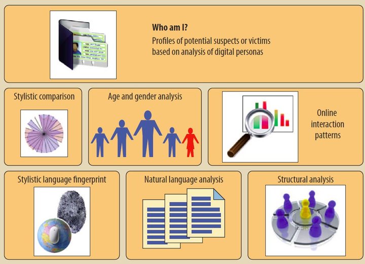 Аваис Рашид, Алистейр Бэрон, Пол Рейсон, Коринн Мей-Чахал, Фил Гринвуд и Джеймс Вокердайн (Awais Rashid, Alistair Baron, Paul Rayson, Corinne May-Chahal, c.may-chahal@lancaster.ac.uk, Lancaster University, UK, Phil Greenwood, James Walkerdine, Isis Forensics, Lancaster, UK) представили статью «Кто я? Анализ цифровых личностей при исследовании киберпреступности» («Who Am I? Analyzing Digital Personas in Cybercrime Investigations»). Цифровые сообщества не только способствуют сближению людей, но также невольно предоставляют преступному миру новые способы онлайнового доступа к потенциальным жертвам. В криминальной тактике в онлайновых социальных сетях ключевую роль играют цифровые личности. Входя в контакт с потенциальными жертвами, один преступник может скрываться под несколькими цифровыми личностями, или группа преступников может совместно пользоваться одной личностью. Кроме того, неустойчивая природа индивидуальности в онлайновой социальной сети означает, что преступники могут относительно легко замаскироваться, чтобы войти в доверие к потенциальным жертвам. Примеры такого преступного использования цифровых личностей включают следующее: Педофилы, маскирующиеся под молодежь для завоевания доверия своих жертв. Преступник может использовать несколько личностей в ходе взаимодействия, изначально представляясь молодым человеком, а затем вводя другую личность – например, более взрослого родственника. В других случаях преступная группа может совместно использовать одну и ту же личность, так что несколько человек могут в разное время домогаться одной и той же жертвы. Мошенники на доверии (romance scam operator), использующие цифровые личности соответствующего возраста и пола для установления контактов с несколькими жертвами на онлайновых сайтах знакомств и использования их с целью получения финансовой выгоды. Радикализация молодежи на онлайновых форумах на основе посылки убедительных сообщений. Иногда преступники в тактических целях используют несколько личностей. Например, одна личность используется для решительной поддержки некоторой радикальной идеи. После этого несколько дней длится пауза, после чего другая личность на форуме заявляет, что исходный герой уехал, чтобы бороться за эту идею. Однако эффективный полицейский контроль в таких средах чрезвычайно затруднителен – в онлайновых социальных сетях циркулирует огромный объем информации, что делает практически невозможным ее анализ вручную. Соответственно, правоохранительные учреждения не успевают анализировать данные социальных сетей во время расследования киберпреступлений. Обычным делом являются задержки на пять, а то и девять месяцев. Хотя в таких расследованиях можно применять коммерческие инструменты, такие как EnCase и Internet Evidence Finder, они в основном помогают извлекать данные. Любой анализ этих данных должен выполняться следователем, владеющим только простыми средствами типами поиска по ключевым словам или выявления фраз на основе определяемых пользователем списков слов. Такие методы не масштабируются, и они не опираются на модели обманного поведения или совместного использования онлайновых личностей. Не редки случаи, когда следователи извлекают данные с жестких дисков или из мобильных телефонов с использованием, например, EnCase, а затем вручную анализируют их, чтобы определить, когда было совершено преступление, и одна или несколько цифровых личностей исп