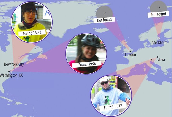 Каждая команда получила по одной фотографии каждого разыскиваемого человека («подозреваемого») в 8 часов утра в день проведения соревнования. Как показывает рисунок, каждый «подозреваемый» был одет в майку с логотипом соревнования (это не было известно участникам соревнования до начала раздачи фотографий подозреваемых). По условиям соревнования каждый подозреваемый в течение 12 часов должен был передвигаться по своему обычному маршруту. Команда-победительница (в которую входили авторы статьи) смогла разыскать трех подозреваемых с использованием Web, мобильного приложения и схемы поощрений. Никто из членов команды раньше не бывал в городах подозреваемых.