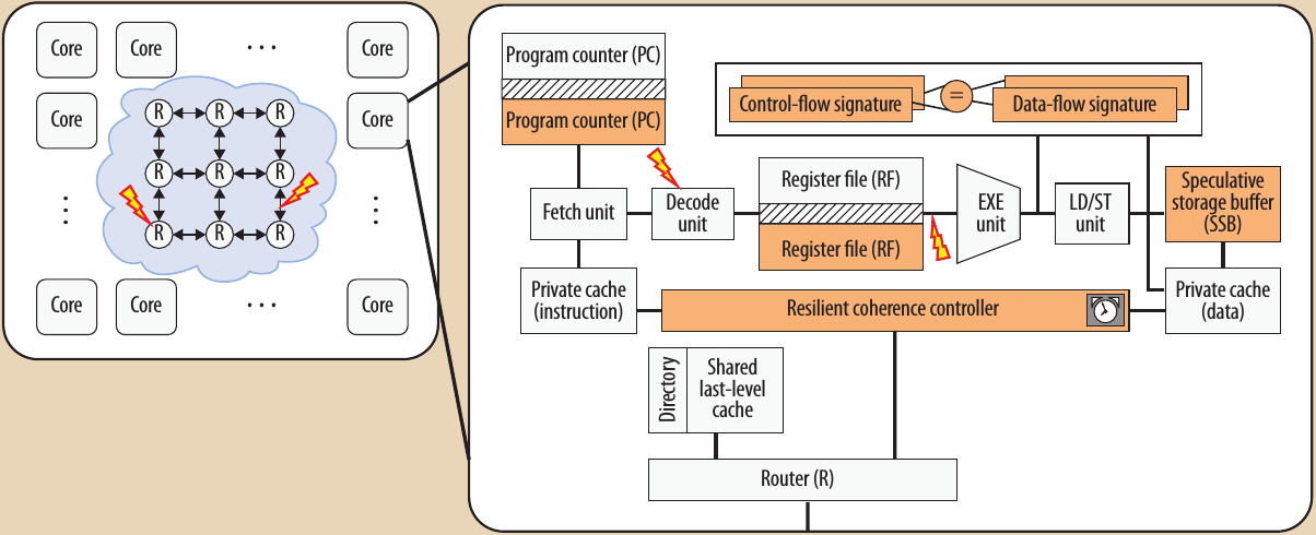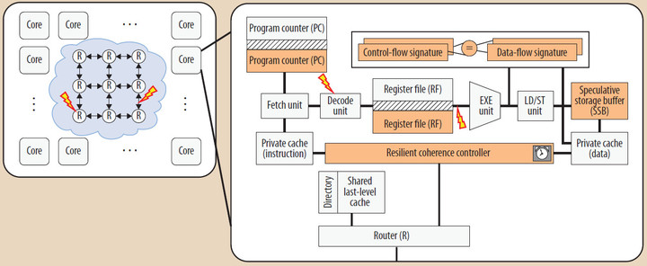 Завершает тематическую подборку статья «На пути к многоядерным процессорам с общей памятью, устойчивым к единичным неисправностям» («Toward Holistic Soft-Error-Resilient Shared-Memory Multicores»), авторами которой являются Кинчуан Ши и Омер Хан (Qingchuan Shi, Omer Khan, University of Connecticut). Закон Мура позволяет интегрировать в одной микросхеме многие миллиарды транзисторов. Однако это сопровождается все большей неустойчивостью процессов функционирования микросхем, а также усугублением проблем старения и надежности. Процессоры должны обеспечивать высокую производительность в условиях ограниченного энергоснабжения, но действительно серьезную проблему для будущих компьютерных систем вызывает наличие единичных неисправностей. Неустойчивые искажения логических значений могут привести к эффектам, видимым пользователям, от ошибок программного обеспечения, возникновения синхронизационных тупиков на уровнях приложений, протоколов и аппаратуры до полного отказа системы. Разработчики микросхем не могут справиться с такими ошибками на основе тестирования и вынуждены полагаться на методы поддержки устойчивости во время работы микросхем. Сегодняшние многоядерные микропроцессоры содержат набор разнотипных ядер и встроенных подсистем памяти, связываемых все более сложными коммуникационными сетями и протоколами. На уровне аппаратуры устойчивость базируется в основном на избыточности, что влияет на размеры микросхем, их энергопотребление и производительность. Выполнявшиеся ранее исследования в области аппаратной избыточности концентрировались на последовательных или независимых мультипрограммных приложениях, выполняемых на одноядерных многопотоковых процессорах (см., например). Протоколы, поддерживающие совместное использование памяти, сложны, и любая протокольная ошибка, проявляющаяся внутри ядра или коммуникационной среды, может привести к синхронизационным тупикам на уровне аппаратуры, повреждению состояния программы из-за несогласованности данных, а в худшем случае – к катастрофическому отказу системы. Поэтому требуется разработать механизмы, обеспечивающие устойчивое к ошибкам выполнение будущих многоядерных процессоров с общей памятью. Авторы предлагают архитектуру устойчивого к единичным сбоям многоядерного процессора, в котором ядра, поддерживающие многопотоковые приложения, могут повторно выполнять детерминированные непрерываемые последовательности команд без потребности в глобальных контрольных точках, откатах и синхронизации. Этот подход напоминает подход транзакционной памяти. Каждое ядро автономно восстанавливает состояние программы и производит ее перезапуск на основе локально доступных данных. Предлагаемая архитектура обеспечивает повторное выполнение последовательностей команд в тех случаях, в которых аппаратура наиболее уязвима к единичным сбоям. Это обеспечивает динамический механизм, позволяющий балансировать требования к производительности и энергопотреблению с требованием устойчивости системы к единичным сбоям.