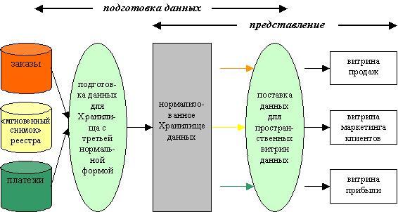 Рисунок 1. Нормализованное Хранилище данных с пространственными витринами итоговых данных (CIF).