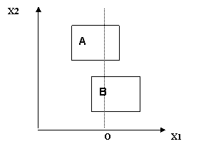 Рис. 2. Отнесение недостаточно описанного объекта к двум классам. Два непересекающихся класса, A и B, описаны в пространстве признаков {X1, X2}. Объект исследования O представлен одним признаком X1, признак X2 у объекта отсутствует. На основе имеющейся информации объект может быть отнесен к обоим классам. Для более точной оценки нужно было бы добавить контрольному объекту значение признака X2 (так же поступают и в медицине: если имеющихся показателей не хватает для дифференцирования заболеваний, только дополнительное исследование позволит сделать окончательный вывод), но на практике это не всегда возможно. До сих пор считалось, что попадание объекта в область пересечения классов является препятствием для оценки объекта. Когда от этой ситуации не уйти, ее надо постараться использовать. Для этого будем использовать аналоги – объекты соответствующих классов, попадающие в ту же область пересечения. Предположим, база прецедентов подверглась предварительной обработке – разбиению на классы эквивалентности. Три способа такого разбиения были указаны в предыдущем разделе. Рассмотрим один из них – кластеризацию – как частный случай, не требующий предварительного обучения. При рассмотрении текущего случая точка, соответствующая ему, сравнивается с пространственным расположением кластеров в проекции на пространство его признаков. Близкими считаются прецеденты, принадлежащие кластеру, в который попадает случай. Если он попал в область пересечения кластеров, то ближайшими к нему будут прецеденты, также находящиеся в области пересечения (очевидно, что они могут быть наиболее полезны при выборе решения). Допустим, он попал в область пересечения кластеров. В зависимости от сложности пересечения, мы можем разделить все объекты на группы (Рис. 3). Прецеденты, находящиеся в одной с текущим случаем области пересечения, естественно считать более близкими к нему, чем те, что находятся только в одном из кластеров, потому что с тем же набором признаков, что и текущий случай, они подобны ему по принадлежности к понятиям, обозначаемым кластерами. Сравнив введенное понятие близости с тем, что говорилось в предыдущем разделе, нетрудно заметить, что предложенная метрика является локальной и контекстно-зависимой. Локальной, потому что привязана к текущему случаю, контекстной – потому что зависит от его набора признаков. Приведем более строгое определение предлагаемой меры: Расстояние между текущим случаем и прецедентом равно разности количества кластеров, куда попал текущий случай, и количества кластеров из этого числа, в котором находится прецедент. Это значит, что расстояние между текущим случаем и прецедентом, находящимся в той же области пересечении кластеров, равно нулю. На Рис. 3 цифрами помечены области с соответствующим этим цифрам расстоянием между текущим случаем и прецедентами из этой области.