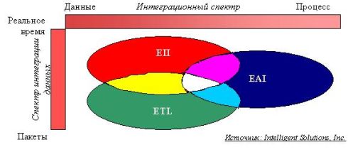 Аналитические решения: понимание трех составляющих интеграции - EAI, EII, ETLКлодиа Имхофф (Claudia Imhoff)Перевод: Intersoft Lab Проблема интеграции корпоративной информации, данных и приложений остается актуальной для многих организаций. С ростом объема информации задача объединения разрозненных структур, таких как витрины, базы или Хранилища данных, становится жизненно важной для многих компаний. Мы уже обращались к проблемам интеграции корпоративной информации и приложений (см. статьи "Интеграция корпоративной информации: новое направление" и "Интеграция корпоративных приложений: основные понятия"). Сегодня мы предлагаем вниманию читателя статью, в которой сравниваются три основных современных подхода к проблеме интеграции - это технологии интеграции корпоративных приложений и информации, а также технология извлечения, преобразования и загрузки данных. Помните, что случилось с Шалтаем-Болтаем? "И вся королевская конница, и вся королевская рать не может Шалтая-Болтая собрать". Многие IT-профессионалы часто ощущают себя подобно этому персонажу. С тех пор, как были написаны первые компьютерные программы, IT-специалисты ведут борьбу с дезинтеграцией, порожденной компьютерной эрой, стараясь снова собрать воедино данные и приложения. Интеграция корпоративных данных и приложений - это задача, давно стоящая перед многими организациями, однако до последнего времени технологические возможности в этой сфере были довольно ограниченными. К счастью, сейчас есть три технологии, которые могут помочь в этом. Автор статьи именует их "три 'И'" (или три "Е" в английском варианте). Это iинтеграция корпоративных приложений (enterprise application integration, iсокр. EAI), iинтеграция корпоративной информации (enterprise information integration, iсокр. EII) и программное обеспечение для iизвлечения, преобразования и загрузки данных (extract, transform and load, iсокр. ETL). Эти технологии могут быть использованы для широкого круга задач: от интеграции в режиме реального времени до пакетной интеграции и от интеграции данных до интеграции приложений. На рис. 1 показано положение названных технологий по отношению к этим двум спектрам задач. Для интеграции данных в режиме реального времени лучше всего подходит технология EII. Для пакетной интеграции данных - ETL. А для интеграции приложений, в режиме реального времени или пакетном, наиболее подходящим инструментом является технология EAI.