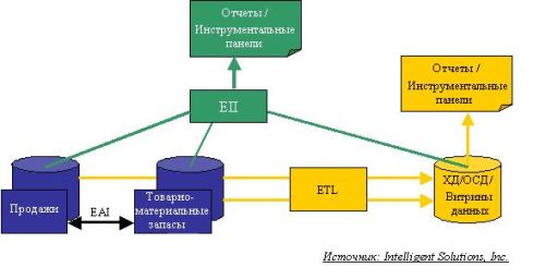 Рисунок 2. Место технологий EAI, EII и ETL в уже существующей архитектуре Технология EAI наиболее функциональна тогда, когда необходимо связать приложения в реальном времени для автоматизации бизнес-процессов. Второй случай применения EAI - это ситуация, когда необходимо, чтобы изменения, внесенные в одно приложение (обычно это небольшой набор записей), были отражены во всех других. Эта технология очень хорошо справляется с задачей фиксации изменений и их переноса в соответствующие приложения или системы. Технология ETL оказывается наиболее полезной в тех случаях, когда необходимо создать Хранилище данных, содержащее хорошо документированные и надежные данные для исторического анализа, например, для анализа временных рядов или многомерных запросов. Эта технология также используется для интеграции ключевых справочных данных. Технология ETL незаменима для таких задач, как удаление дублирующихся данных, осуществление процессов проверки качества данных и т.п. Эти инструменты также используются для создания отдельных витрин данных, обслуживающих конкретный отдел или бизнес-процесс или предназначенных для каких-либо долгосрочных целей. Инструменты ETL дают пользователю возможность запустить повторяющиеся процессы для большей слаженности действий и возможности их многократного использования. Такие процессы включают создание точных технических метаданных, поддерживающих общую целостность среды business intelligence (BI). Технология EII лучше всего подходит в тех случаях, когда необходимо создать общий шлюз (gateway) с едиными языком и точкой доступа к несогласованным источникам данных. Такие инструменты предоставляют приложениям и конечным пользователям возможности более гибкого, а также незапланированного доступа к данным, при этом не требуя постоянного использования данных или долговременных целей для получения этого доступа. Помимо традиционных реляционных баз данных, инструменты EII могут работать с XML- и LDAP-файлами1, плоскими файлами и другими нереляционными данными. Эти инструменты также способны представлять реляционные данные в формате XML или формате web-сервисов. Особенно полезны инструменты EII, если есть необходимость добавить к справочным данным Хранилища дополнительные детали, в частности, детальную информацию в реальном времени (например, сопоставление исторических данных с текущей ситуацией). Кроме понимания того, когда необходимо использовать эти технологии, нужно также знать и проблемы, которые им присущи. Во-первых, внедрение этих технологий требует от IT-персонала глубокого понимания тех требований, которые предъявляются к данным для принятия как тактических, так и стратегических решений. Применительно к технологии ETL это означает, что необходимые данные извлекаются, преобразуются и загружаются в виде, пригодном для использования непосредственно аналитиками или EII-сервером. В случае EII-технологии, способы представления данных должны удовлетворять отчетным требованиям аналитиков, т.е. данные должны быть пригодны для использования в аналитических отчетах. Во всех случаях понимание источников данных и требований, предъявляемых к данным, является необходимым шагом при внедрении этих технологий и безусловно оправдывает то время, которое приходится тратить, чтобы достичь этого понимания. Кроме того, необходимо поним