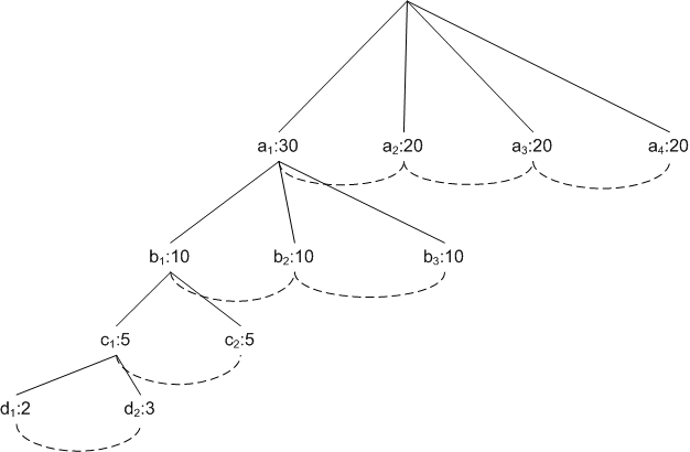 изображена часть дерева куба для подкуба ABCD. Каждый уровень дерева представляет собой измерение, и каждый узел представляет собой значение атрибута. Каждый узел имеет 4 поля: значение аттрибута, агрегированное значение, указатель/указатели на потомков и указатель/указатели на элементы того же уровня. Кортежи подкуба вставляются в дерево один за другим. Путь от корня к листу представляет собой кортеж. К примеру, агрегированное значение (по мере count) узла