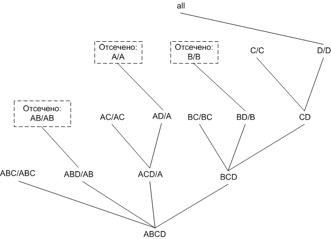Обзор алгоритмов MOLAPЮрий Кудрявцев, факультет ВМиК МГУ Алгоритм Star-CubingАлгоритм Star-Cubing, представленный в работе [13], предназначен для вычисления кубов типа айсберг. В алгоритме сочетаются агрегирование "снизу-вверх" и "сверху-вниз", многопозиционное агрегирование (как в алгоритме MultiWay) и применение леммы Apriori (как в алгоритме Bottom-Up Computation). Данные хранятся в специальной структуре star-tree, эффективно сжимающей данные, что позволяет сократить время расчета и объем потребляемых ресурсов. На уровня подкубов используется агрегирование снизу-вверх, однако существует уровень обнаружения разделяемых измерений, в котором работа идет сверху-вниз. Подобное сочетание позволяет алгоритму агрегировать по нескольким измерением одновременно, разделяя затраты на агрегирование и используя условие Apriori для отсечения подкубов, не удовлетворяющих условию MinSup . Последовательность вычислений в алгоритме Star-Cubing проиллюстрирована на рисунке 4.2, описывающем вычисление четырехмерного куба ABCD. Если бы использовалась только вычисление снизу-вверх, то подкубы, помеченные словом "отсечено", были бы вычислены. Star-Cubing может отсечь указанные подкубы, принимая в расчет разделяемые измерения. Здесь ACD/A означает, что подкуб ACD имеет разделяемое измерение А, ABD/AB — подкуб AB имеет разделяемое измерение AB, ABC/ABC — подкуб ABC имеет разделяемое измерение ABC и т.д. Таким образом, все подкубы ветви, начинающейся с ACD, включают измерение A, ветви, начинающейся с ABD,- измерение AB, ветви, начинающейся с ABC,- измерение ABC. Подобные измерения называются разделяемыми для соответствующих ветвей.
