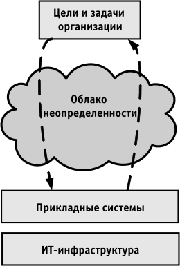Мы уже отмечали, что многие организации испытывают постоянные трудности и находятся в постоянном поиске синхронизации целей и задач бизнеса и процессов развития своих информационных систем. Существует как бы "облако неопределенности" между определением организацией и обеспечивающей ее ИТ-инфраструктурой своих целей и задач [3.3].
