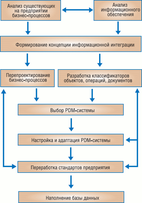 Внедрение: готовность к изменениямВнедрение PDM - длительный процесс, сопровождающийся привлечением значительных ресурсов как со стороны предприятия, так и со стороны поставщика программного обеспечения. Потребуется вносить изменения во все процессы - от работы конструктора до полного пересмотра стандартов предприятия. PDM-система не просто программное обеспечение, которое можно установить и забыть. Это новая технология работы предприятия, новый режим функционирования бизнеса.Поскольку PDM-система предназначена практически для всех подразделений, для ее развертывания необходимо создать специальную проектную группу, возглавляемую руководителем проекта. Очень важно, чтобы руководитель проекта принадлежал к высшему руководству предприятия либо ему были делегированы такие полномочия на время внедрения проекта. В группу со стороны предприятия обязательно должен войти администратор системы - он займется установкой и поддержкой работоспособности PDM-системы. Кроме того, необходимы специалисты, досконально знающие, каким образом происходит движение различной документации и какие изменения она при этом претерпевает. Такие сотрудники помогут при настройке и адаптации системы. В проектную команду надо включать и нескольких опытных пользователей. Со стороны компании-внедренца PDM в проектную команду должны войти руководитель проекта (он же постановщик задач) и группа инженеров по внедрению.