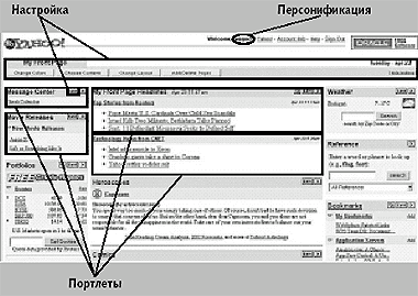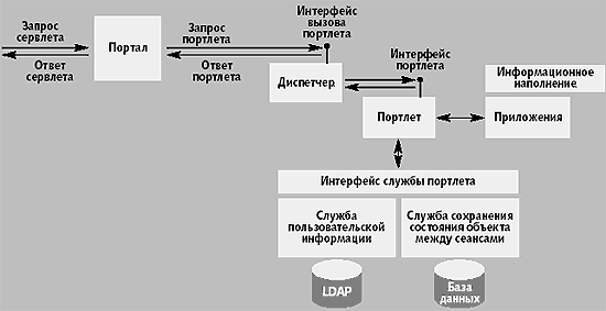 Архитектура и компоненты порталаПри организации общих служб многие реализации порталов используют схожие архитектурные концепции, в том числе портлеты, платформы серверов порталов и интеграция портала с удаленными портлетами. Портлеты и контейнеры портлетов Информационное наполнение часто предоставляется пользователям в форме так называемых портлетов — своеобразных контейнеров, которые, по существу, являются пользовательским представлением соответствующего им персонифицированного информационного наполнения. С технической же точки зрения, портлет — это фрагмент кода, который исполняется на сервере порталов и позволяет встраивать информационное наполнение в страницы портала. В данной статье речь о портлетах и контейнерах портлетов ведется в терминах J2EE, поскольку данная платформа поддерживает и структуру портлетов, и взаимодействие портлетов со средой времени исполнения. Кроме того, большинство реализаций серверов порталов — это Web-приложения на базе J2EE. J2EE — одна из самых известных серверных компонентных моделей. В J2EE серверные компоненты размещаются в специальных контейнерах. Контейнер представляет собой среду времени исполнения для серверного компонента; он вызывает компонент и предоставляет специфические для компонента службы (например, информация о пользователе и сохранение состояния объекта между сеансами). Точно так же портлеты размещаются в контейнерах портлетов. API портлетов определяет интерфейс между портлетом и контейнером портлетов.