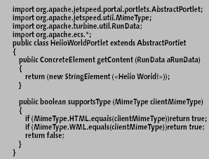На рис. 2 показана простая реализация портлета. Как и сервлет, портлет существует в единственном экземпляре, который создается один раз в контейнере портлетов, а затем может многократно использоваться в различных нитях управления. В состав API портлетов входят следующие элементы: