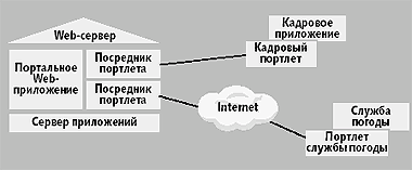 На рис. 3 показаны типичные строительные блоки сервера порталов, созданного как приложение сервлета. Ядро портала получает запрос сервлета от контейнера сервлета и преобразует этот запрос в запрос портлета, который оно направляет соответствующему портлету. Портлет должен извлечь информационное наполнение, используя службы портлета, предоставленные сервером порталов. Затем ядро портала объединяет множество ответов портлетов и возвращает ответ сервлета пользователю. Чтобы корректным образом вывести страницу, служба агрегирования должна учесть предпочтения пользователей и возможности устройства. Удаленные портлеты Порталы получают информацию и информационное наполнение из многих источников, в том числе из внутренних систем и от провайдеров приложений и информационного наполнения на базе Internet. Чтобы интегрировать новый источник, владелец портал должен адаптировать информационное наполнение к формату, который воспринимается порталом, что может оказаться весьма длительным и трудоемким процессом. Процесс интеграции можно упростить одним из двух способов. При первом подходе внешние провайдеры услуг поставляют информационное наполнение в формате, который непосредственно воспринимается клиппирующим портлетом (как правило, HTML или WML). Однако этот подход ограничивает возможности портала готовить информационное наполнение в соответствии с особенностями конкретного канала взаимодействия с пользователем. При втором подходе владелец портала устанавливает портлет на сервере порталов внешнего провайдера услуг. Затем портлет получает информационное наполнение в своем особом формате для вывода его как части общей страницы портала. Однако размещение кода независимого поставщика на сервере может оказаться небезопасным как с точки зрения стабильности, так и с точки зрения защиты информации. Например, портал для сотрудников может предоставить доступ к размещаемой в Internet информации о погоде и приложению управления кадрами в системе планирования ресурсов предприятия. Чтобы предоставить такой доступ, администратор запускает портлеты локально, как показано на рис. 4.