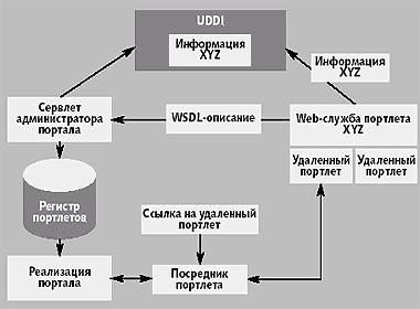 Удаленные портлеты используют промежуточных посредников, которые позволяют провайдерам предлагать информационное наполнение или приложения, не требуя настройки вручную. Вместо того чтобы добавлять сам портлет на сервер порталов, владелец портала просто подключает его к общему посреднику портлета, который взаимодействует с удаленным портлетом. Удаленные портлеты поддерживаются другим сервером порталов или модулем исполнения портлетов (он представляет собой усеченный сервер порталов, действующий исключительно как среда исполнения портлетов). Модуль исполнения портлетов обладает функциональностью, достаточной для того, чтобы дать возможность удаленному портлету реагировать на вызовы посредника портлета. Таким образом, посредник портлета не нуждается в таких службах, как объединение и настройка. Модуль исполнения портлетов может также быть реализован в другой технологии (например,.Net), если она поддерживает протокол удаленного вызова портлетов, поддерживаемый посредником портлета. Чтобы обеспечить интероперабельность между различными серверами порталов и поставщиками информационного наполнения, необходима стандартизованная модель взаимодействий для посредника портлета и удаленного портлета. В настоящее время над стандартом на Web-службы для удаленных портлетов работает организация Organization for the Advancement of Structured Information Standards (OASIS). Web-службы для удаленных порталов Web-службы для удаленных порталов (Web services for remote portals, WSRP) представляют собой визуальные, настроенные на пользователя компоненты Web-служб, которые подключаются визуально, методом буксировки к порталам или другим промежуточным Web-приложениям, объединяющим информационное наполнение из различных источников. Поставщики информационного наполнения и приложений реализуют свою службу как Web-службу удаленного портала и публикуют ее в общедоступном каталоге (например, в реестре Universal Description, Discovery, and Integration). Этот каталог позволяет владельцам порталов легко находить необходимые службы. Элементы каталога, опубликованные в формате Web Services Description Languag, кратно описывают компонент WSRP и предоставляют детальную информацию о службах. Посредник портлета связывается с компонентом WSRP через SOAP, а протокол удаленного вызова портлета (remote portlet invocation, RPI) гарантирует корректное взаимодействие между обеими сторонами. На рис. 5 показан пример того, как портал находит и интегрирует удаленный портлет.