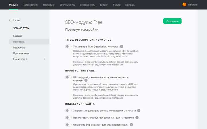 В остальном вы не будете чувствовать себя стеснёнными: подключайте свой домен, редактируйте код, используйте любые доступные модули. Да, некоторые из последних во Free-версии являются немного урезанными, но не критически. Например, доступ к расширенным SEO-параметрам или работе с PHP предоставляется на платном аккаунте. Но и в бесплатном можно работать с оптимизацией на приличном уровне. PHP же нужен далеко не всем. Это, скорее, удел профи.