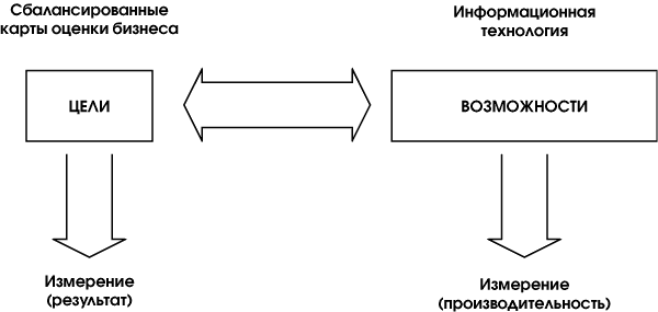 В настоящее время информационные услуги преобладают над прочими поддерживающими бизнес услугами. Таким образом, ИТ становятся одним из первостепенных показателей бизнеса. Как следствие — отношения между бизнес-целями с их единицами измерения и ИТ с его целями и единицами измерения являются очень важными и могут быть изображены следующим образом (Рис. 6).