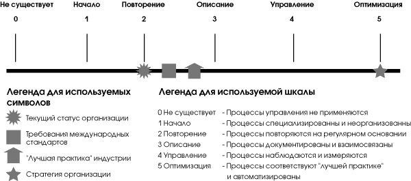 Беря за основу шкалу моделей зрелости (Рис. 7), разработанную для каждого из 34 ИТ-процесса CobiT, руководитель может выяснить следующие сведения: