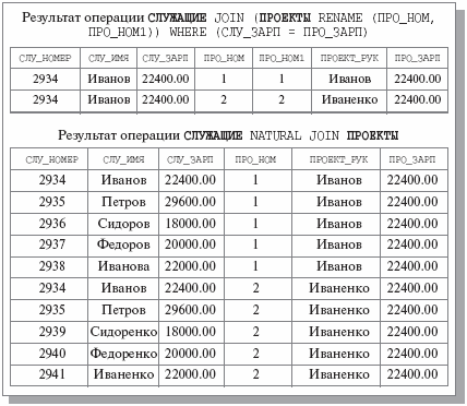 Рис. 4.9. Результаты операций эквисоединения и естественного соединения отношений СЛУЖАЩИЕ и ПРОЕКТЫ