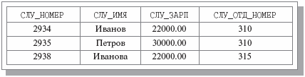 Рис. 4.5. Результат операции СЛУЖАЩИЕ_В_ПРОЕКТЕ_1 WHERE (СЛУ_ЗАРП 200 > 20000.00 AND (СЛУ_ОТД_НОМ = 310 OR СЛУ_ОТД_НОМ = 315))