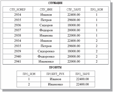 Тогда осмысленной операцией соединения общего вида будет СЛУЖАЩИЕ JOIN ПРОЕКТЫ WHERE (СЛУ_ЗАРП > ПРО_ЗАРП) (выдать данные о служащих, получающих заработную плату, превышающую среднюю заработную плату любого проекта). Результаты этого запроса показаны на рис. 4.8.