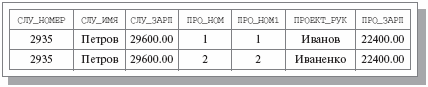 Рис. 4.8. Результат операции СЛУЖАЩИЕ JOIN ПРОЕКТЫ WHERE (СЛУ_ЗАРП > ПРО_ЗАРП)