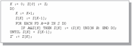 Алгоритм построения замыкания множества атрибутов Z над заданным множеством FD S помогает легко установить, входит ли заданная FD Z