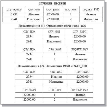Анализ рис. 7.3 показывает, что в случае декомпозиции (1) мы не потеряли информацию о служащих – про каждого из них можно узнать имя, размер зарплаты, номер выполняемого проекта и имя руководителя проекта. Вторая декомпозиция не дает возможности получить данные о проекте служащего, поскольку Иванов и Иваненко получают одинаковую зарплату, следовательно, эта декомпозиция приводит к потере информации. Что же привело к тому, что одна декомпозиция является декомпозицией без потерь, а вторая – нет?