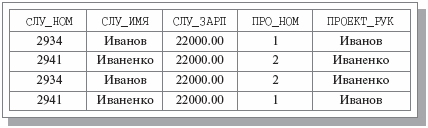 Заметим, что при проведении декомпозиции мы использовали операцию взятия проекции. Каждое из отношений СЛУЖ, СЛУ_ПРО и ЗАРП_ПРО является проекцией исходного отношения СЛУЖАЩИЕ_ПРОЕКТЫ. В случае декомпозиции (1) отсутствие потери информации означает, что в результате естественного соединения отношений СЛУЖ и СЛУ_ПРО мы гарантированно получим отношение, заголовок и тело которого совпадают с заголовком и телом отношения СЛУЖАЩИЕ_ПРОЕКТЫ. Следует отметить, что это произойдет для любых допустимых (и согласованных) значений переменных отношений СЛУЖАЩИЕ_ПРОЕКТЫ, СЛУЖ и СЛУ_ПРО, поскольку у всех этих переменных атрибут СЛУ_НОМ является возможным ключом. Однако если выполнить естественное соединение отношений СЛУ и ЗАРП_ПРО, то будет получено отношение, показанное на рис. 7.4.
