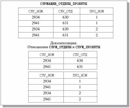 На рис. 7.3 приведены две возможные декомпозиции отношения СЛУЖАЩИЕ_ПРОЕКТЫ (для экономии места мы сократили и слегка изменили тело отношения из рис. 7.1).