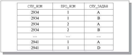 СЛУ_ЗАДАН. Первая MVD означает, что каждому значению атрибута СЛУ_НОМ соответствует определяемое только этим значением множество значений атрибута ПРО_НОМ. Другими словами, в результате вычисления алгебраического выражения