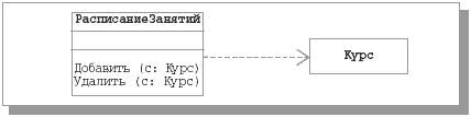 Для класса 11.2.2. Категории связей. Связь-зависимостьВ диаграмме классов могут участвовать связи трех разных категорий: зависимость (dependency), обобщение (generalization) и ассоциация (association). При проектировании реляционных БД наиболее важны вторая и третья категории связей, поэтому о связях-зависимостях будет сказано только самое основное. Зависимостью называют связь по применению, когда изменение в спецификации одного класса может повлиять на поведение другого класса, использующего первый класс. Чаще всего зависимости применяют в диаграммах классов, чтобы отразить в сигнатуре операции одного класса тот факт, что параметром этой операции могут быть объекты другого класса. Понятно, что если интерфейс второго класса изменяется, это влияет на поведение объектов первого класса. Простой пример диаграммы классов со связью-зависимостью показан на рис. 11.4.