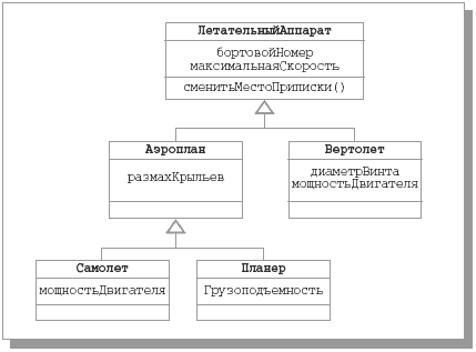 Зависимость показывается прерывистой линией со стрелкой, направленной к классу, от которого имеется зависимость. Очевидно, что связи-зависимости существенны для объектно-ориентированных систем (в том числе и для ООБД). При проектировании реляционных БД непонятно, что делать с зависимостями (как воспользоваться этой информацией в реляционной БД?). 11.2.3. Связи-обобщения и механизм наследования классов в UMLСвязью-обобщением называется связь между общей сущностью, называемой суперклассом, или родителем, и более специализированной разновидностью этой сущности, называемой подклассом, или потомком. Обобщения иногда называют связями «is a», имея в виду, что класс-потомок является частным случаем класса-предка. Класс-потомок наследует все атрибуты и операции класса-предка, но в нем могут быть определены дополнительные атрибуты и операции. Объекты класса-потомка могут использоваться везде, где могут использоваться объекты класса-предка. Это свойство называют полиморфизмом по включению, имея в виду, что объекты потомка можно считать включаемыми во множество объектов класса-предка. Графически обобщения изображаются в виде сплошной линии с большой незакрашенной стрелкой, направленной к суперклассу. В качестве первой иллюстрации, приведенной на рис. 11.5, воспользуемся классификацией летательных аппаратов с рис. 10.12 из предыдущей лекции. На рис. 11.5 показан пример иерархии одиночного наследования: у каждого подкласса имеется только один суперкласс.