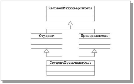 Одиночное наследование является достаточным в большинстве случаев применения связи-обобщения. Однако в UML допускается и множественное наследование, когда один подкласс определяется на основе нескольких суперклассов. В качестве одного из разумных (не слишком распространенных) примеров рассмотрим диаграмму классов на рис. 11.6 (для упрощения диаграммы имена атрибутов и операций указывать не будем).