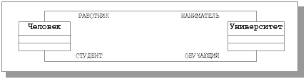 Другим способом именования ассоциации является указание роли каждого класса, участвующего в этой ассоциации. Роль класса, как и имя конца связи в ER-модели, задается именем, помещаемым под линией ассоциации ближе к данному классу. На рис. 11.8 показаны две ассоциации между классами